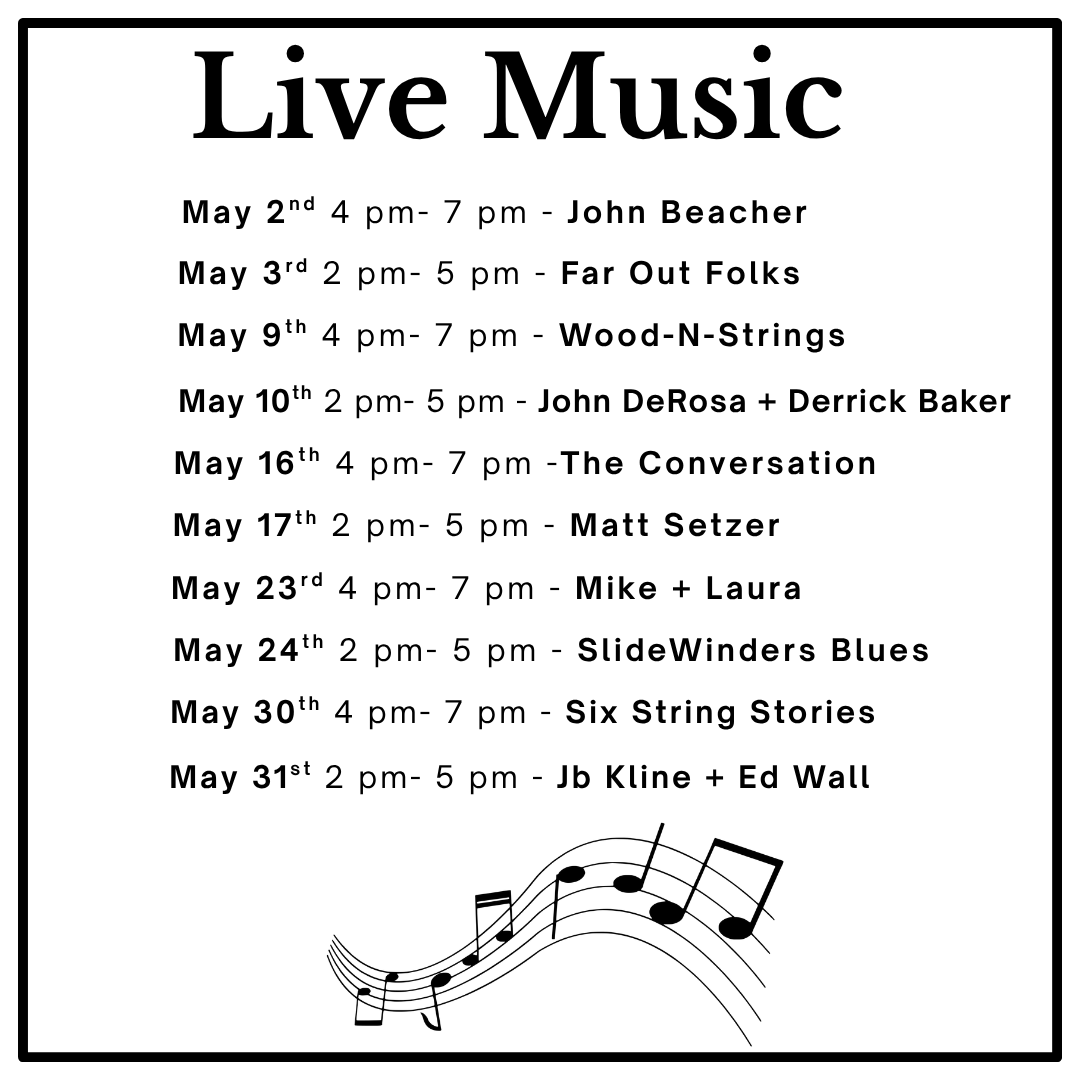 Enjoy live music every Saturday and Sunday outdoors! Veranda seating is first come, first serve for guests 17 and over, with reservations available. Bring your family, chairs, or blankets to relax in the field. Lawn games and pop-up tents are welcome, but must be secured.